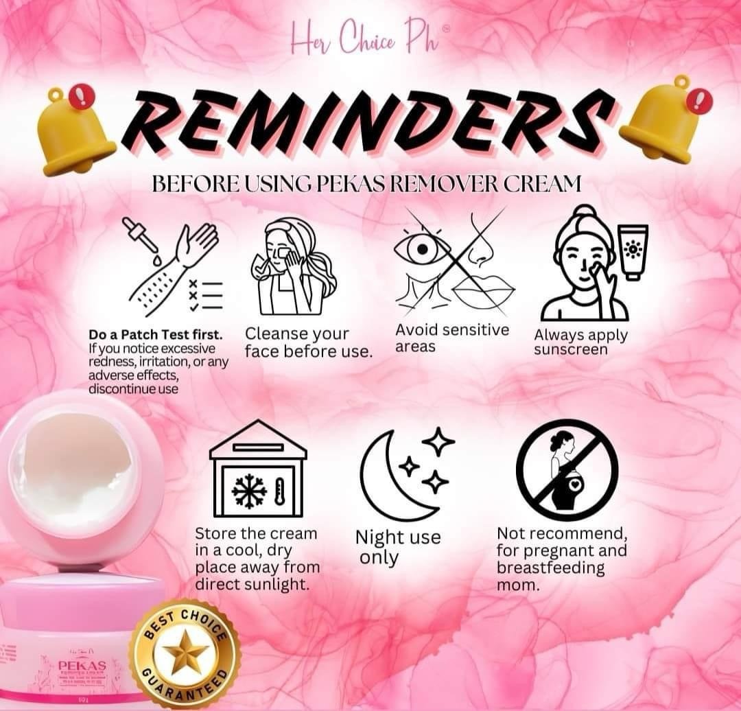 Her Choice Ph's Pekas Remover Cream has the best formula to help you deal with your skin hyperpigmention, melasma, pekas,freckles, and other dark patches of skin while promoting collagen production for firmer, smoother, and brighter skin all around. This is also anti-acne and anti-aging suited for all skin types.