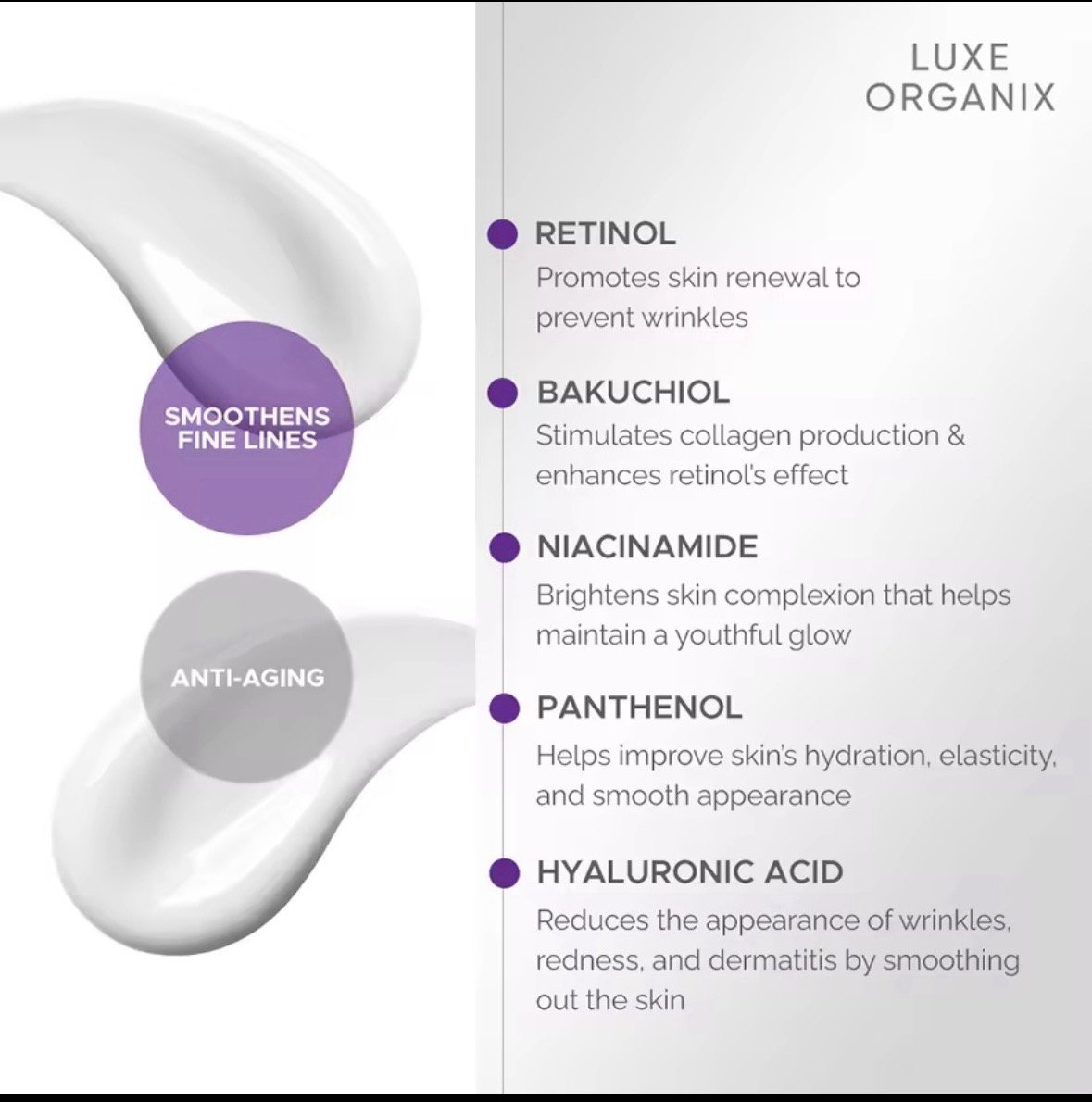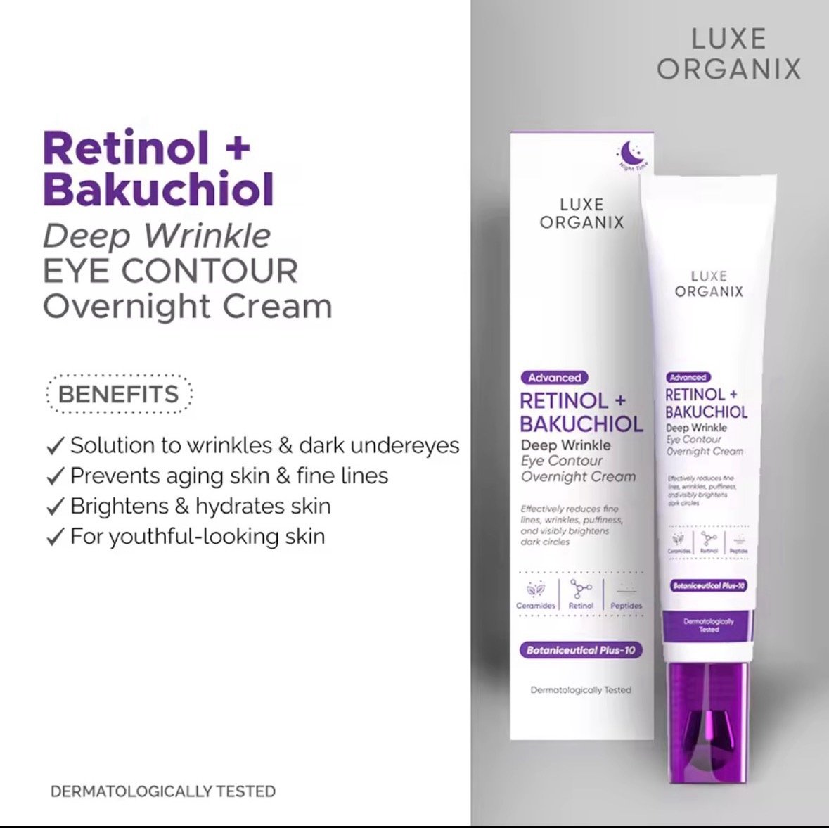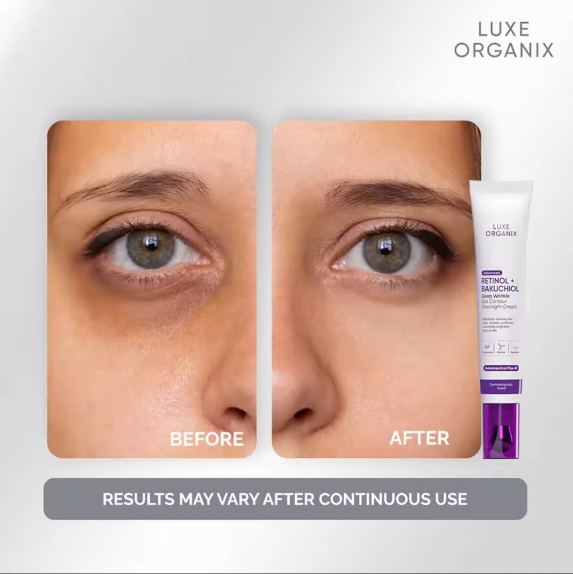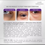 Luxe Organix Advanced Retinol + Bakuchiol Deep Wrinkle Eye Contour Overnight Cream is your solution to wrinkles & dark undereyes! Made with 0.05% pure retinol, this superior anti-aing active boosts skin cell renewal to prevent wrinkles and fine lines.